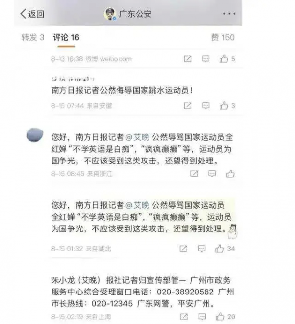 网友并没有善罢甘休,跑去"广东公安"账号下喊话,希望公安部门介入调查,严查这名体育记者。