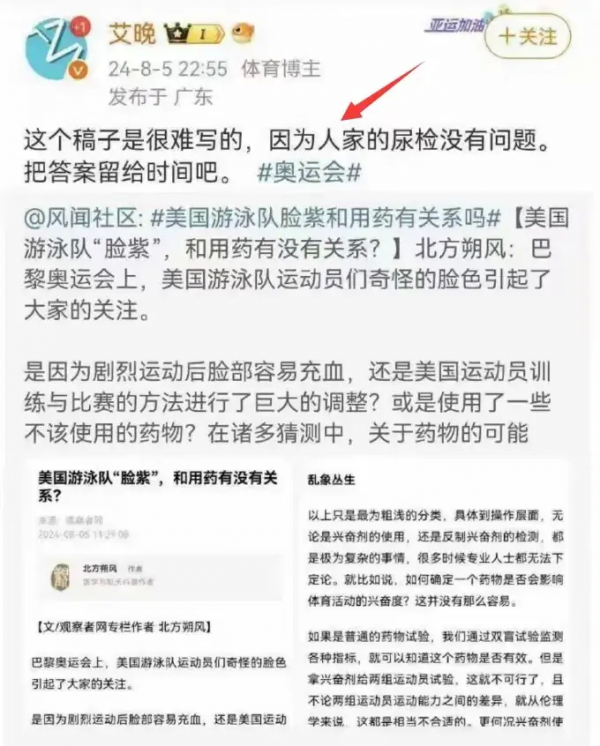 话里话外都是我国媒体刻意抹黑美国运动员,有意把美国运动员脸紫和用药产生关联。这不就是为美国运动员洗白吗?