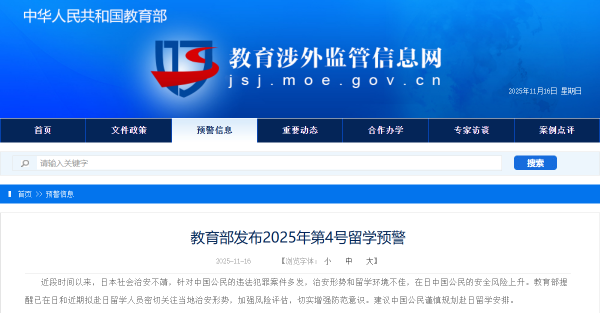 教育部发布第4号留学预警:建议中国公民谨慎规划赴日留学安排