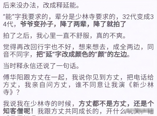 他感慨地说:"'能'字我要求的,辈分是少林寺要求的,32代变成34代,爷爷变孙子,降了两辈,降了就拍了。"
