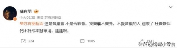 可没成想,音乐会官宣后,有些粉丝的关注点却偏了--因为VIP票有1V10的合影环节,但票少难抢,不少人开始喊着"普通票也想要合影",甚至说"没有合影就不参加了"。这让苏有朋心里落差特别大,一时冲动就在超话发了句"这是音乐会,不是合影会。我卖艺不卖身。不爱音乐的人别来了"。