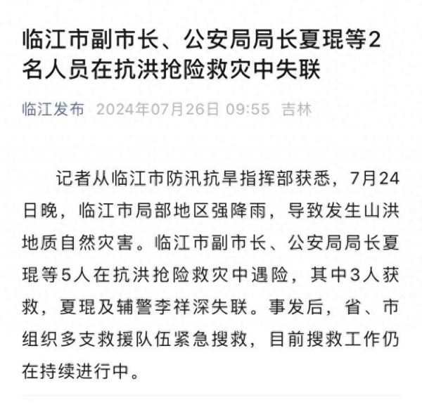 临江融媒体中心公众号"临江发布"消息称,7月24日晚,临江市局部地区强降雨,导致发生山洪地质自然灾害。临江市副市长、公安局局长夏琨等5人在抗洪抢险救灾中遇险,其中3人获救,夏琨及辅警李祥深失联。事发后,省、市组织多支救援队伍紧急搜救,目前搜救工作仍在持续进行中。