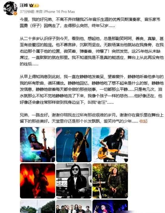最近刷到汪峰在社交平台发长文,说一起做音乐二十多年的好兄弟韦国勇走了,才52岁。说实话我之前不太了解韦国勇是谁,但看汪峰写的"二十几年没缺席过我的舞台",就知道这哥们儿在乐队里肯定很重要。后来查了下,韦国勇是贝斯手,从汪峰早期火起来就开始合作,好多经典歌里都有他的编曲。汪峰说知道消息时整个人都懵了,光听老歌回想起过去的事,连饭都吃不下--这种突然失去朋友的感觉,换成谁心里都难受。