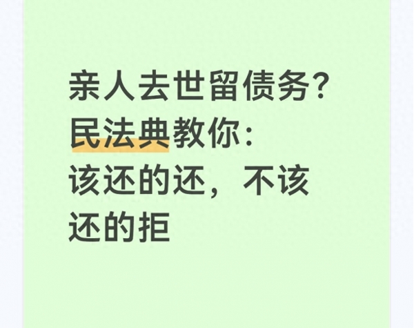 "父债子还""人死债消"的老观念,早就被民法典的明确规定取代了。对继承人来说,继承遗产是权利,偿还债务是义务,权利和义务要对等;对债主来说,合法的债权受法律保护,只要债务人有遗产,就有机会要回钱。