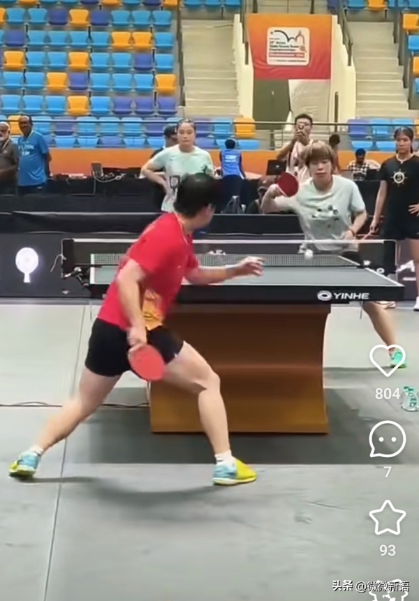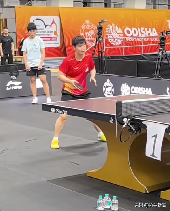 看大迪打球,就是很有力量。看到徐奕和朱梓予在另一边看她俩训练,莎莎这是换上红色比赛服了,后面一个镜头看到陈幸同也在那里。中国队的比赛一般都安排在一号台,所以比赛球台安装好后,先是印度队的在那训练,后面国乒女队在那练球,今年用的有缝球,应该好适应一些。