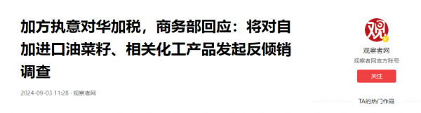 除此之外,商务部还宣布,将对产自加拿大的进口油菜籽进行反倾销调查,对加拿大相关化工用品发起反倾销调查。
