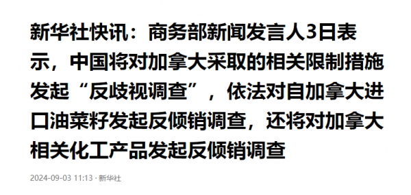 9月3日,中国商务部宣布,将对加拿大提出的相关限制措施发起"反歧视调查"。