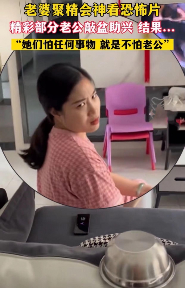 盆子发出"当"的一声,妻子被吓得一激灵!顿时从恐怖的气氛中清醒过来,转过身来眼神幽怨地盯着老公。