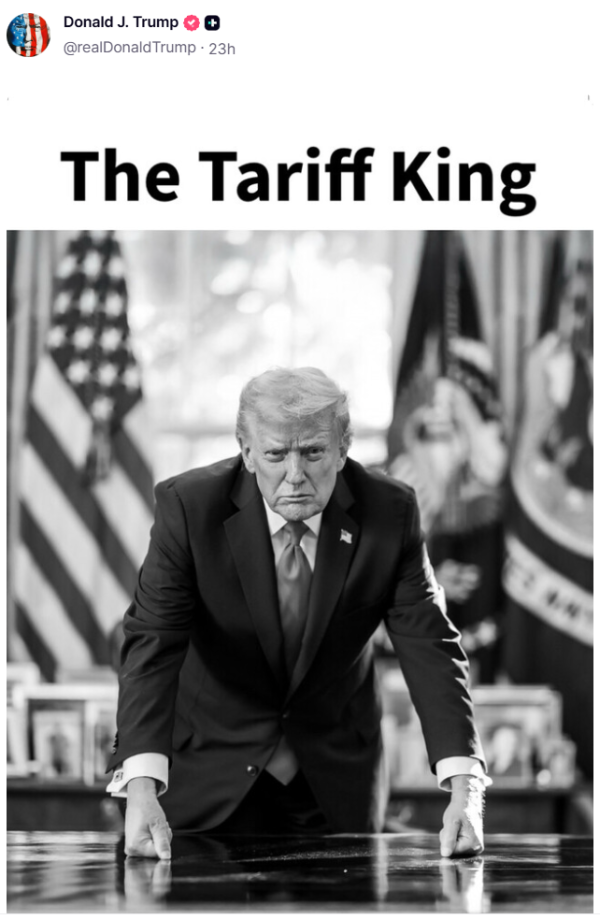 当地时间1月17日,美国总统特朗普在"真实社交"平台发布一张个人黑白照片,并自诩为"关税之王"。