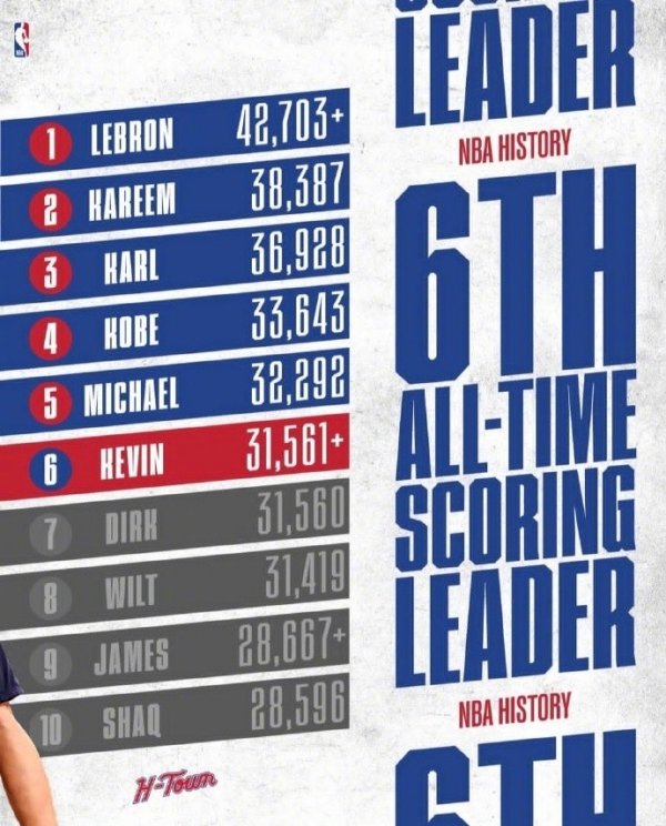 本场杜兰特迎来个人里程碑,他全场得到18分6篮板8助攻1抢断,NBA生涯总得分(31562分)正式超越德克-诺维茨基,升至历史第六位!