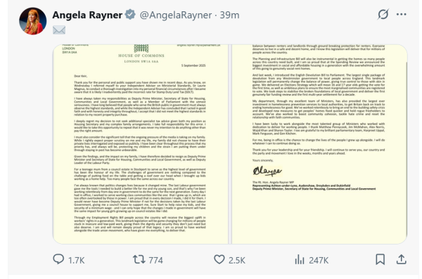 对此,英国首相斯塔默也在社交平台发出公开信件回应称,他对雷纳在这样的情况下结束其政府任期感到非常遗憾,但她做出了正确的决定。