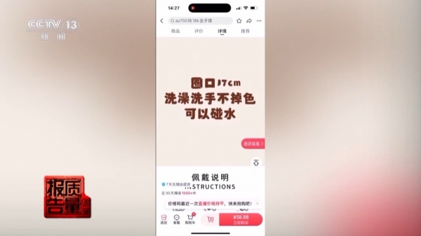 记者调查发现,在多个电商平台及带货直播间,售价几十元的饰品,在产品介绍中写道"洗澡洗手不掉色",并反复提示消费者是镀18K金。
