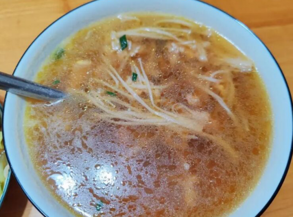 油麦菜吃起来口感清脆,香味扑鼻,老少皆宜。金针菇瘦肉汤的做法较为简单。把瘦肉煸炒之后,加入水里煮开,再加入金针菇,撒一点自己用的小香葱,清口不油腻。