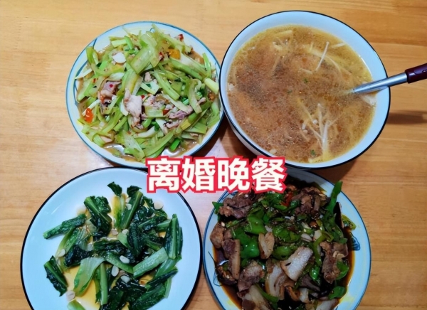 她想为自己的婚姻做一个了断的仪式,精心为对方准备了三菜一汤,分别是炒油麦菜,西芹炒肉,辣椒炒肉,金针菇瘦肉汤。