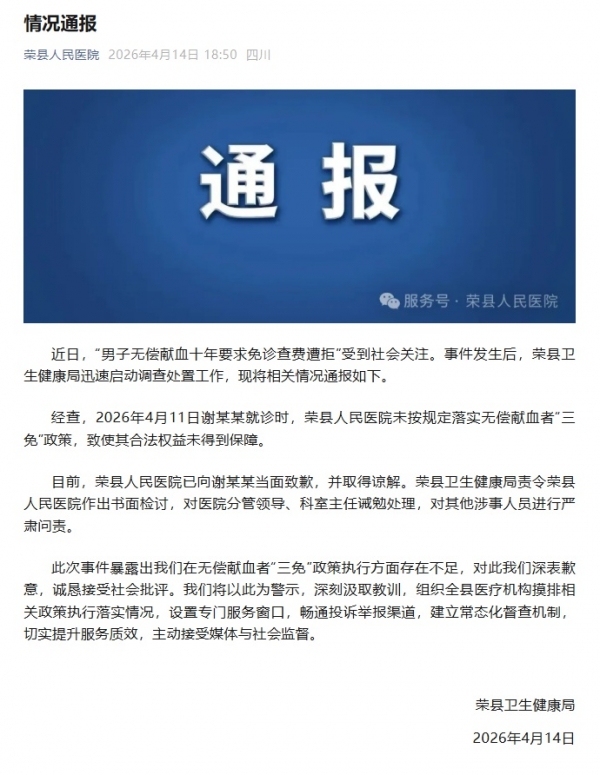 此次事件暴露出我们在无偿献血者"三免"政策执行方面存在不足,对此我们深表歉意,诚恳接受社会批评。我们将以此为警示,深刻汲取教训,组织全县医疗机构摸排相关政策执行落实情况,设置专门服务窗口,畅通投诉举报渠道,建立常态化督查机制,切实提升服务质效,主动接受媒体与社会监督。
