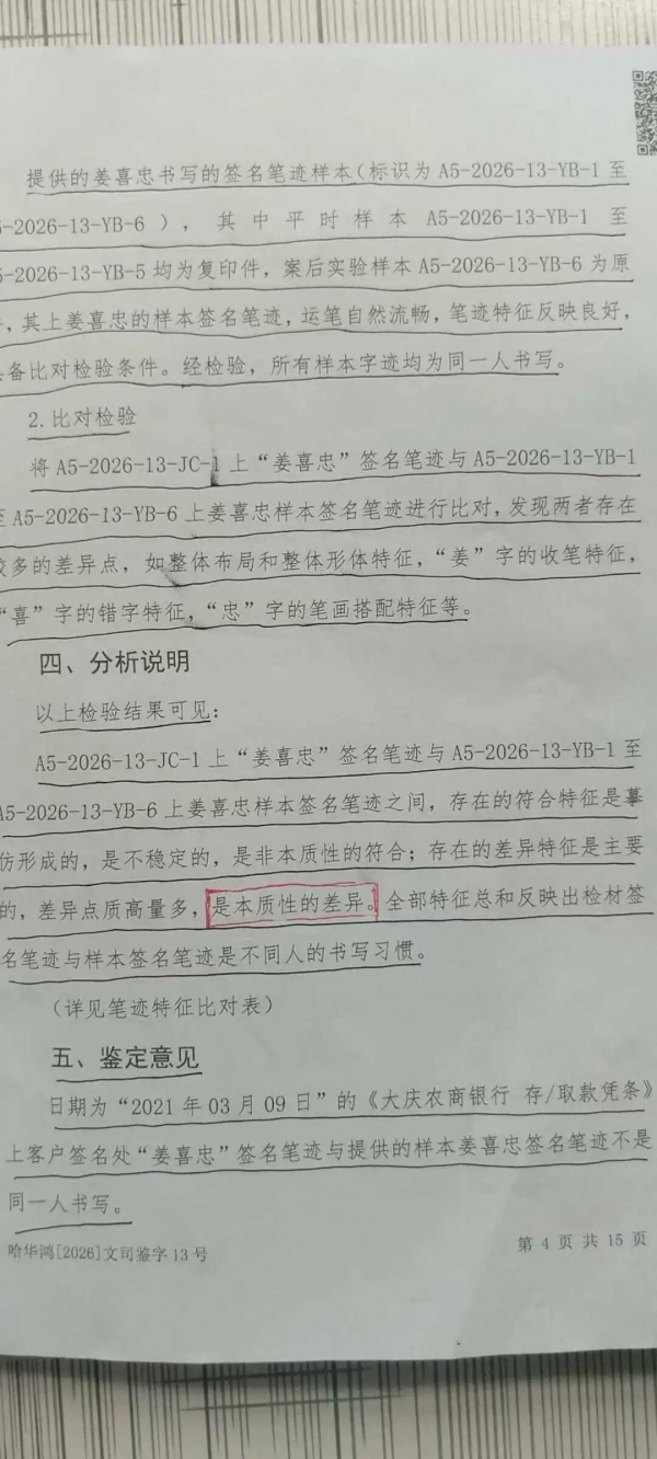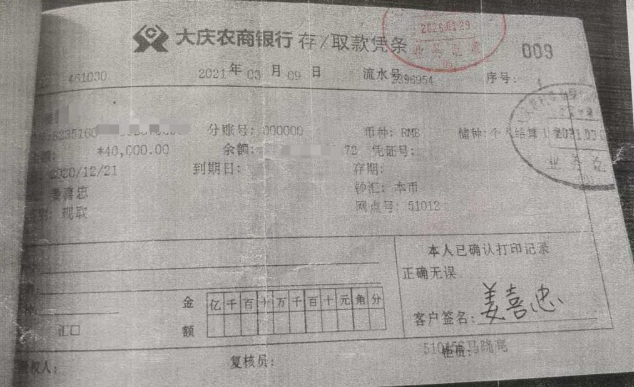 2025年11月,黑龙江大庆的姜喜忠发现,自己存在当地农商行账户里的钱,好像不知不觉少了一大截。他调出流水和取款凭证,发现其中多笔取款签名看着眼生。为了弄个明白,他自掏腰包,花3000元一次的鉴定费,将三笔可疑取款的签名送去做笔迹鉴定。结论是:签名系伪造。