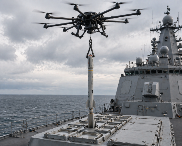 据防务网站"海军新闻"(Naval News)报道称,印度海军最近发布了一则关于"使用无人机进行海上再装填"(Rearming by Drone)的"问题陈述",其内容旨在开发一款"用于为海上舰艇垂直发射装置装填舰空导弹"的多旋翼无人机。