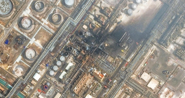 2日,沙特拉斯坦努拉炼油厂遭无人机袭击后冒出黑烟。(视觉中国)