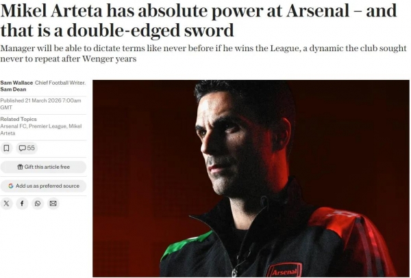 电讯报记者SW和SD联合发文表示,阿尔特塔在阿森纳拥有绝对权力,但这是一把双刃剑。