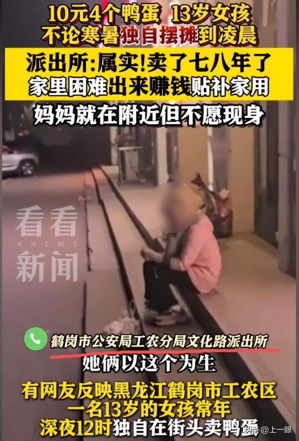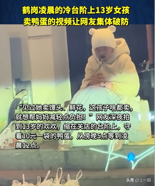 网友深夜拍到13岁的小女孩,缩在关店的台阶上,守着10元一袋的鸭蛋,从傍晚5点等到凌晨12点。
