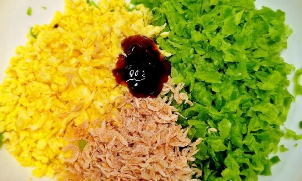 2.碗内打入2个鸡蛋,加入适量的盐,用筷子搅散,下锅炒熟炒碎后,放凉,装入盆中,加入一把虾皮,一勺蚝油,加入适量的盐和食用油,滴两滴香油,搅拌均匀,调成菜馅。