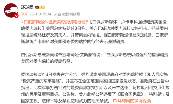 据环球网援引白俄罗斯通讯社3日消息,白俄罗斯总统卢卡申科对美国侵略委内瑞拉的行径表示强烈谴责。