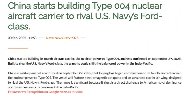 受福建舰电磁弹射掀起的舆论热潮,以及之后官方回复"新一代004航母"技术形态的影响,传说中的海军下一代航母又陷入了舆论漩涡。美国"Army Recognition"网站也不甘寂寞,针对004刊文进行分析,并给出了"旨在与'福特'级航母竞争,甚至跃居其上"的结论。