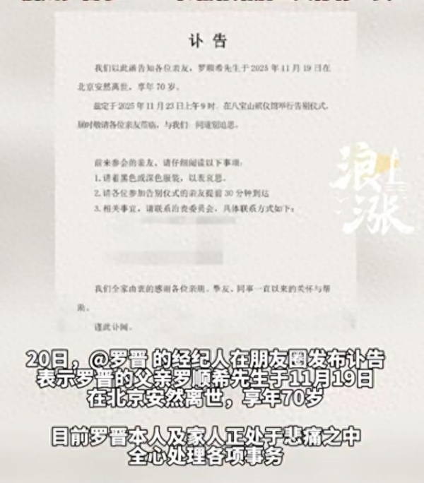 11月20日,罗晋经纪人的一则朋友圈讣告,让这位演员的私人生活再次成为公众焦点。讣告显示,罗晋父亲罗顺希先生于11月19日在北京离世,享年70岁。而就在几天前,罗晋与唐嫣"分居一年半"的传闻正甚嚣尘上,两则消息的叠加,让这个冬天显得格外寒冷。