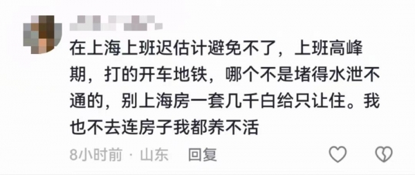 "在上海上班迟估计避免不了,上班高峰期,打的开车地铁,哪个不是堵得水泄不通的,别上海房一套几千白给只让住。我也不去连房子我都养不活"