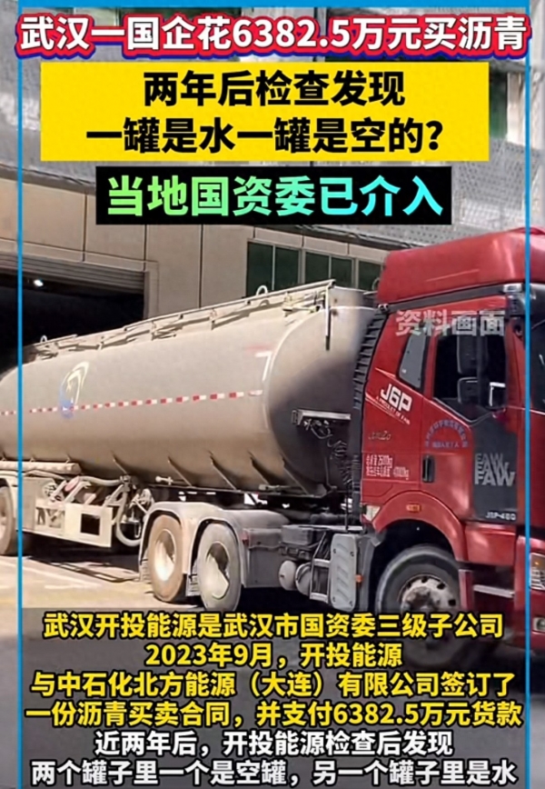 花6382万买15000吨沥青,结果拉货时傻了眼--俩油罐一个装水一个空!这荒诞事儿,就发生在武汉一家国企身上。