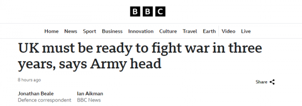 同时他认为,英国还需要关注中国和伊朗这些与俄罗斯关系密切的国家,目前中国决心完成国家统一,而伊朗可能寻求发展核武器。随后沃克给出了"3年"这个数字,并宣称中国、俄罗斯和伊朗等国家构成的"威胁",将在之后3年变得尤为严重,因此英国必须做好在3年内打仗的准备。