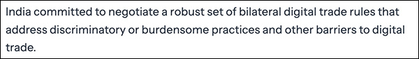 不过,数字贸易仍是敏感领域。美国希望数据流通自由、对科技企业监管最少;印度则希望保留数据治理、竞争政策和数字税收的监管空间。