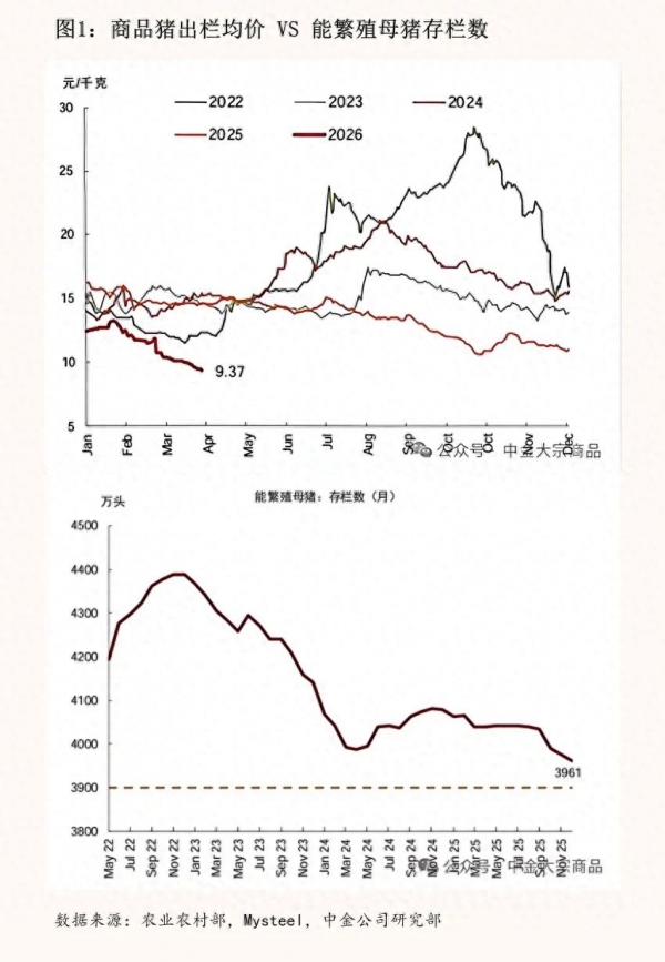 截至2026年2月底,全国能繁母猪存栏量约为3900万头,虽然较2025年末的3961万头有所回落,但距离2026年3月专题会议确定的3650万头调控目标仍有较大差距。关键在于,春季配种已经完成,这意味着2026年内生猪出栏量难以出现实质性拐点,供应压力将持续全年。