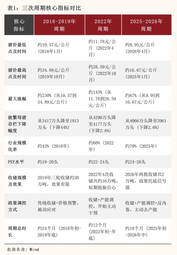 第三,调控方式的转变,2022年政策以收储托底为主,周期反弹主要依靠市场自身调节;而2026年政策已从"软性指导"转向"硬性约束",能繁母猪调控目标从3900万头进一步下调至3650万头,头部猪企实施年度生产备案制,产能调控力度前所未有。