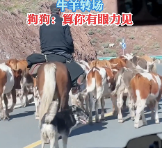 近日,新疆伊犁。女子开车,路边偶遇牧民带着牛羊转场,一条敬业的牧羊犬霸气护送牛羊,示意后面车辆暂停的模样逗笑路人!