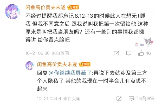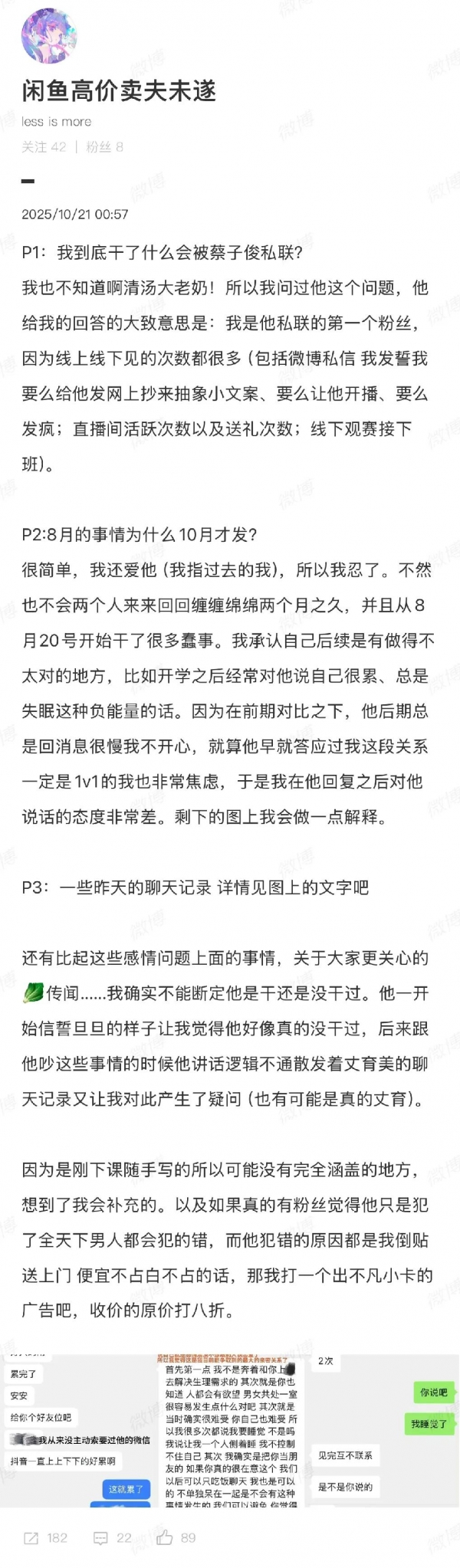 首先,微博用户"闲鱼高价卖夫未遂"(英国IP)于2025年10月21日凌晨发布微博长文控诉Milkyway,其自称是milkyway私联的"首个粉丝"。双方关系始于2025年5月,持续至8月。该人称milkyway主动通过微博私信联系她,后续发展为抖音互关、微信好友(联系方式均为Milkyway主动提供)。