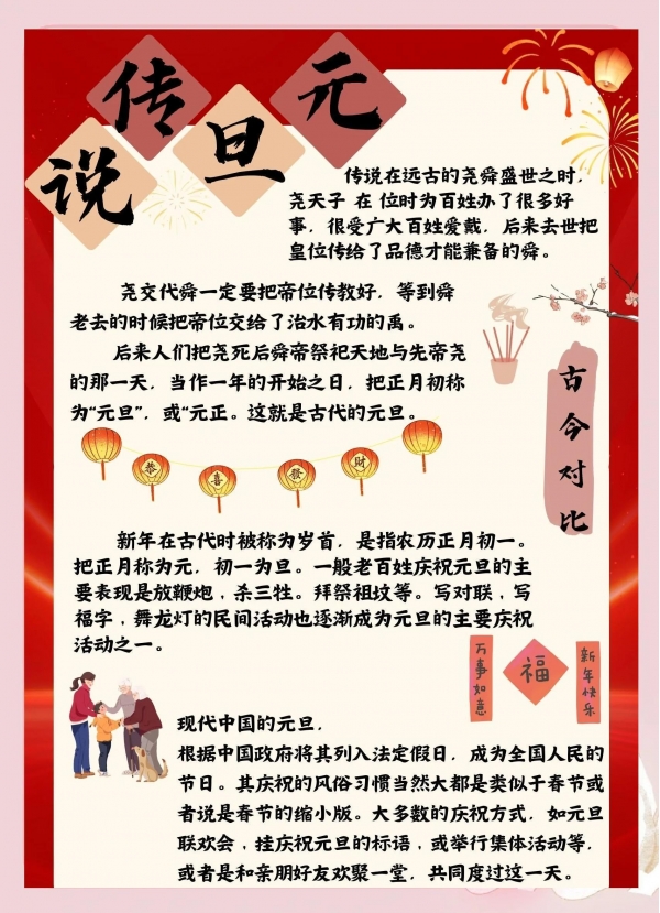 元旦是"初始之日"。古书《说文解字》里说"元,始也";"旦"是太阳跃出地平线的象形。古人把这一天当"开端",拜贺、祈福,寄托新年的期待。《荆楚岁时记》里就写了元旦拜贺后的饮食礼数,可见"送祝福"自古就有。