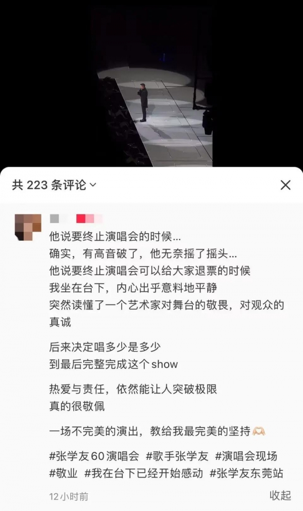 尽管身患感冒,张学友仍坚持登台。但在演唱《饿狼传说》《吻别》等高难度歌曲时,明显能听出他声音沙哑,高音部分多次破音甚至唱不上去。唱到中途,他主动暂停音乐,坦诚向观众解释:"我不确定下半场能否保持稳定,如果大家想退票,我可以立刻联系主办方处理。"