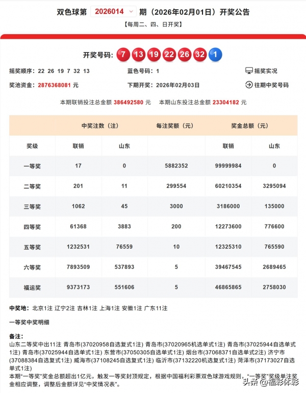 北京时间2026年2月1日双色球第2026014期开奖,本期是新规第一次开奖!