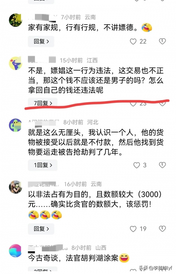 对此有网友觉得,这个判决不合理,拿回嫖资并不算盗窃!因为这也不是受害女子的合法收入啊!