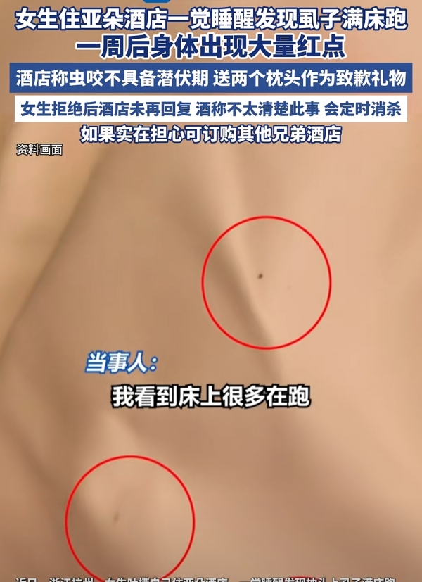 4月下旬,浙江杭州一名女子的入住经历引发全网哗然。据当事人王女士(化名)爆料,她在入住当地一家亚朵酒店后,凌晨醒来竟发现虱子在枕头、床单上四处爬行,后续更确诊虫咬性皮炎,而酒店的回应与处理方式,更是让人气愤不已。这起事件再次将亚朵酒店的卫生管理漏洞推至风口浪尖,也让公众对中高端连锁酒店的卫生标准产生深度质疑。