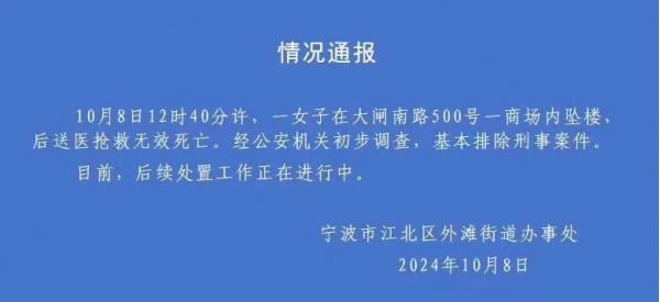 2024年10月8日,江北区大闸南路500号商场发生一女子坠楼事件。