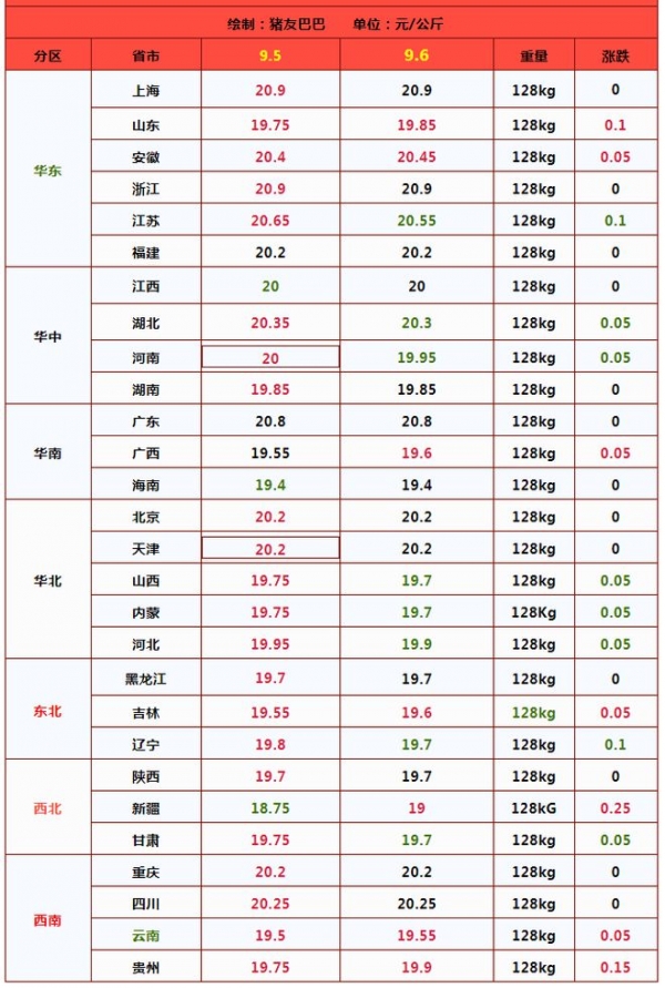 上涨地区,山东、安徽、广西、吉林、新疆以及云贵地区,生猪报价上涨0.05~0.15元/公斤;下跌地区,江苏、湖北、河南、山西、河北、内蒙、辽宁、甘肃地区,猪价下跌0.05~0.1元!其中,在黑吉辽地区,生猪报价在19.6~19.7元,华北山西以及河北报价在19.7~19.9元,陕甘地区报价在19.7元/公斤。在南方市场,川渝报价在20.2~20.25元,山东以及安徽报价在19.85~20.45元,江浙报价在20.55~20.9元,河南报价在19.95元,两湖报价在19.85~20.3元,两广地区报价在19.6~20.8元/公斤!