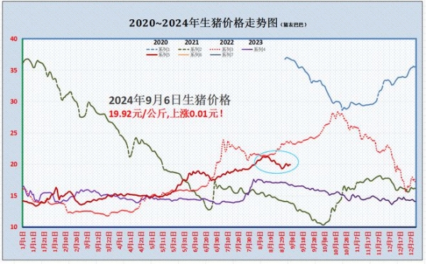 据数据分析,受购销调整,屠企调价收猪,2024年9月6日,全国外三元瘦肉型生猪价格出栏均价在19.92元/公斤,环比昨日上涨0.01元,猪价反弹"势微",市场情绪逐步转弱,北方地区,猪价下跌现象有所增多!