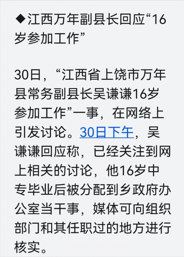 最近,毛奇刚落马,万年县的副县长吴谦谦因为16岁就开始工作受到网友们的质疑,他面对这样的质疑,他回应道:"清者自清,可以到组织部门核实。"