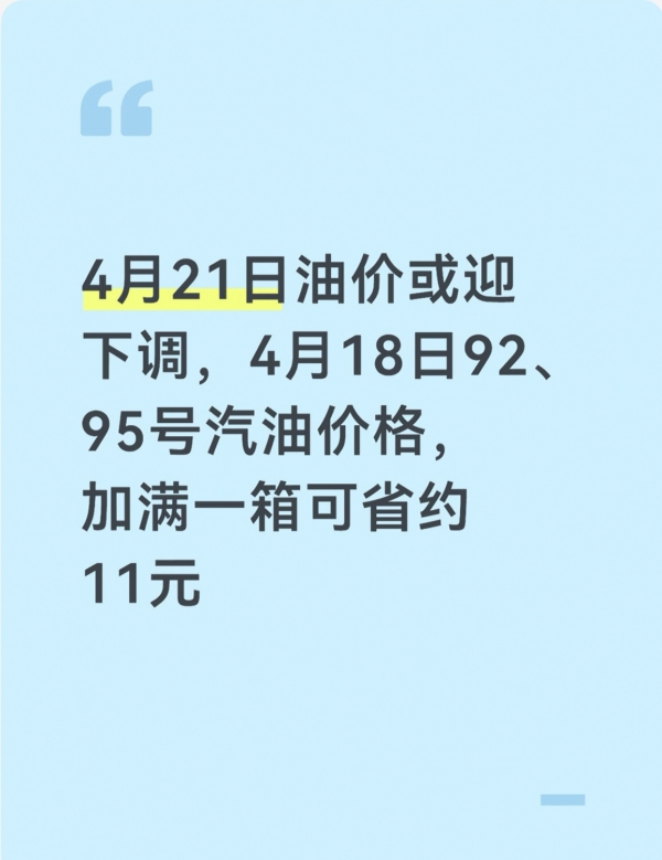 根据国家发改委成品油定价机制,2026年第8轮调价窗口将在4月21日24时开启。截至4月18日,本轮计价周期内国际原油价格整体回落,隆众资讯、卓创资讯、金联创三大能源监测机构同步测算,本轮汽柴油价格预计下调约270元/吨,调整方向明确,为年内较为明显的一次下调。