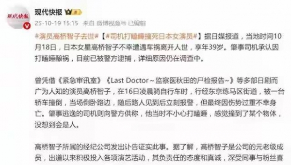 10月16号凌晨,高桥智子骑着自行车,在东京练马区的街道上走着。这时候,一辆轿车"砰"的一下就把她撞倒了,她当场就倒在路边。路人瞧见了,赶紧打电话报警,可最后还是因为伤得太重,没救过来,在10月18号的时候就这么走了,年纪轻轻的,真让人惋惜。