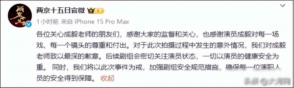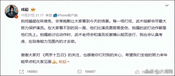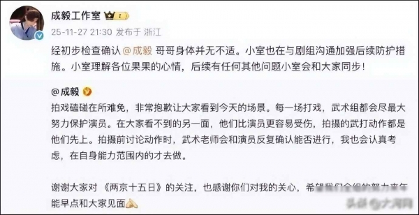 他工作室当晚就说没事,还在跟剧组商量怎么调整防护措施,成毅自己半夜发微博,说拍戏磕碰是常有的事,还特意提到武术组比演员更容易受伤,这话听着挺仗义,其实悄悄把责任推给了幕后工作人员,剧组也赶紧跟着道歉,说以后会多注意。