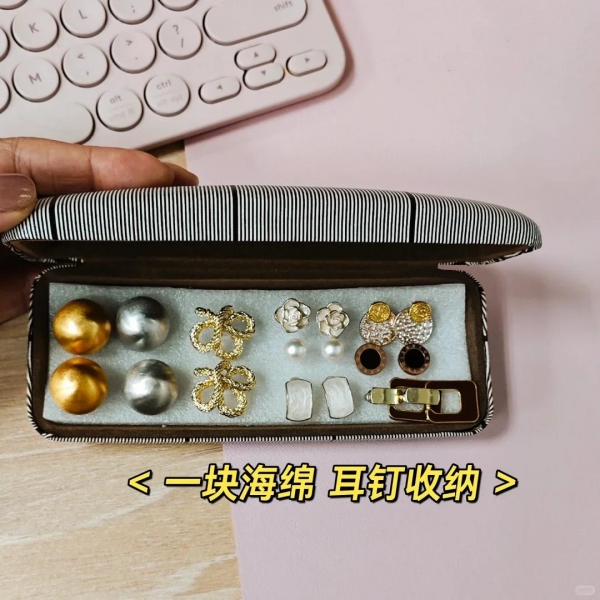 方法特别简单,找一块大小合适的海绵垫,然后放入眼镜盒当中,像我们平常戴的戒指耳环都可以放在里面,直接将耳钉扎在海绵上面就可以了。