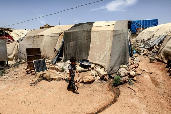 叙利亚伊德利卜,一名儿童走在一个临时帐篷旁